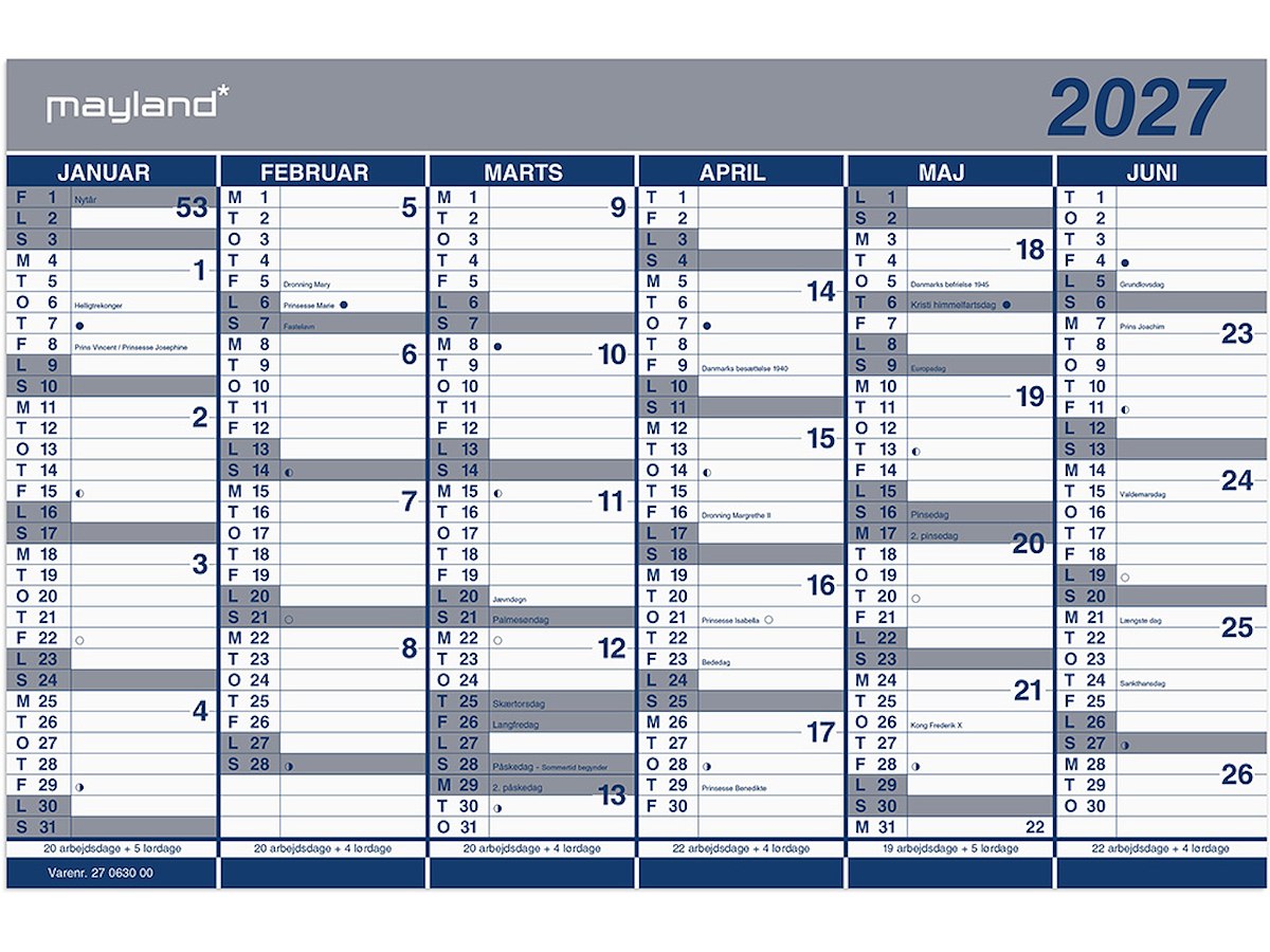 Vægkalender, 2027, Dobbelt, 6 måneder pr. side, Mayland
