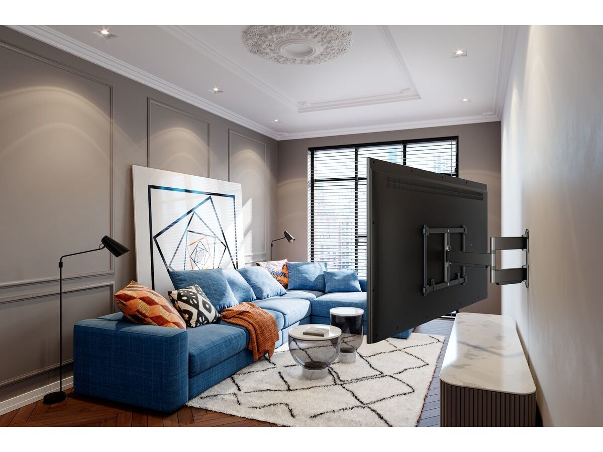 Med ELITE Full-Motion+ TV-vægbeslag kan du nyde dit TV fra alle vinkler. Vægbeslaget har ekstra lange støttearme på 56 cm. Afhængigt af skærmstørrelsen kan du dreje dit TV op til 90° til venstre og højre. Og takket være OneFinger™ Movement kan du nemt dreje din skærm til den ønskede synsvinkel med kun én finger. Det har ikke vippefunktion, fordi det er bedst ikke at vippe store, skrøbelige skærme.
