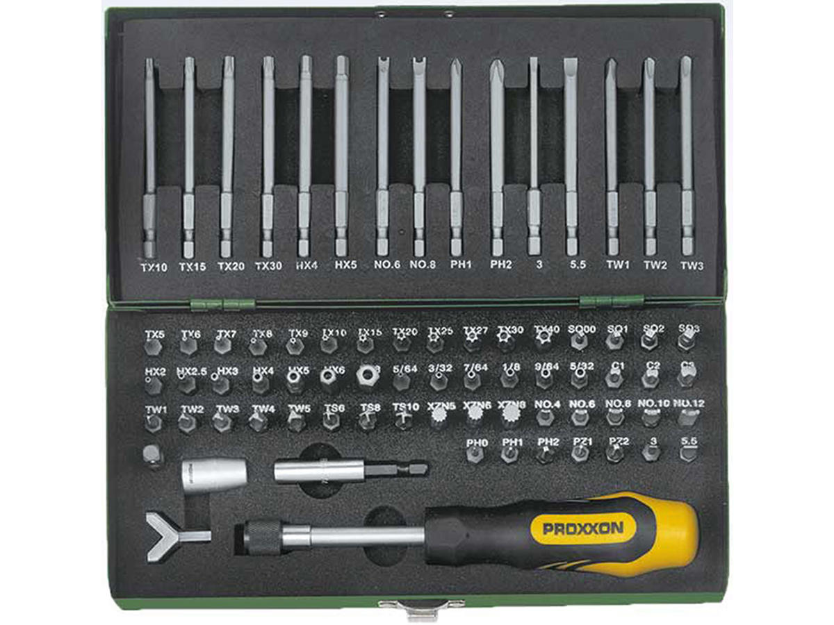 Bitssæt i smart kuffert, 1/4" drev. Med ekstra bits i lang version til skruer i gevindskårne blinde huller. 75-dele.
