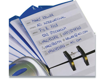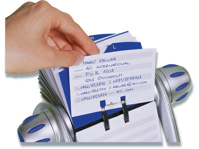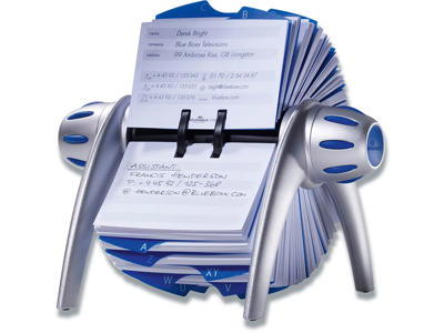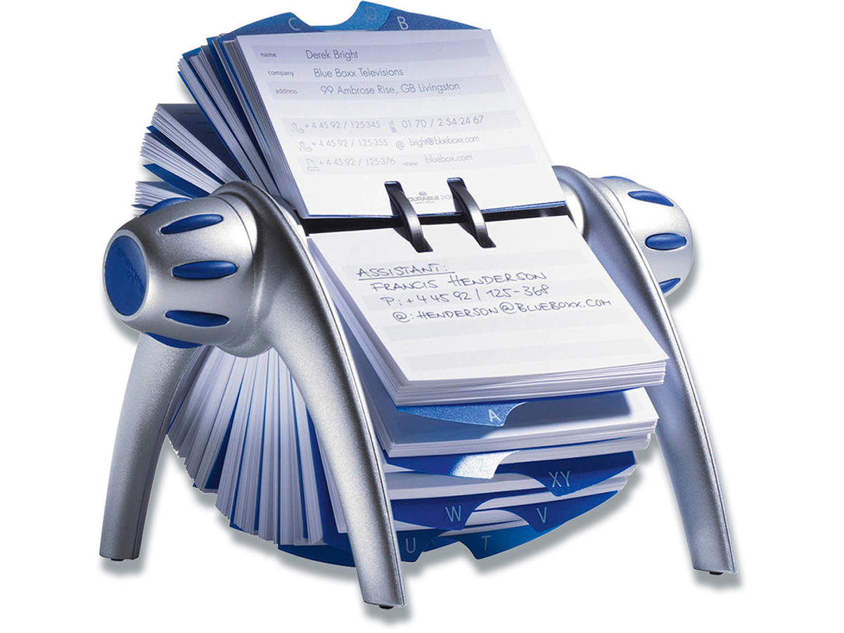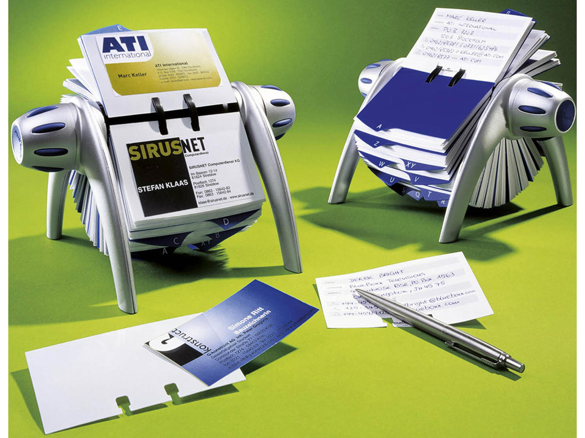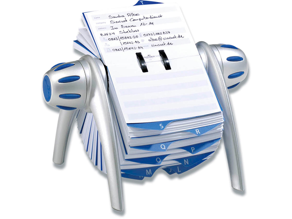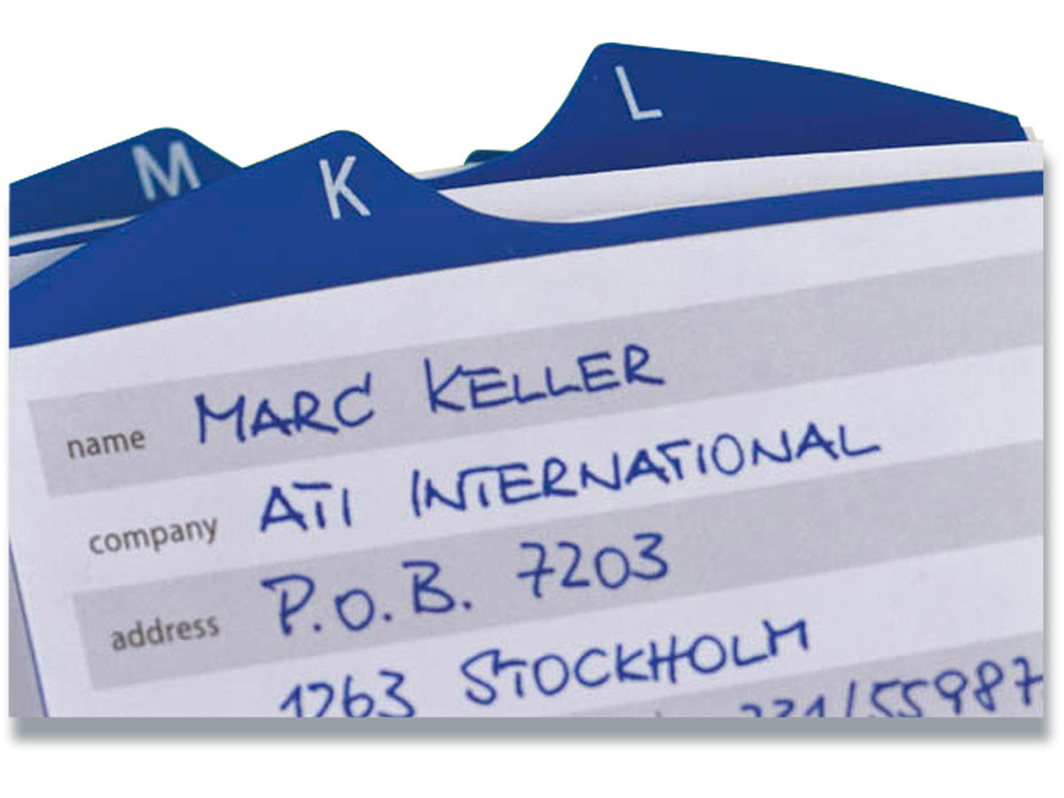 Rullekartotek til telefonnumre og adresser. Med blød rotation og låsefunktion. Leveres komplet med 500 dobbeltsidet kartotekskort (104x72 mm) og 25 delt indexfaner A-Z. Enkel fjernelse og indsættelse af kartotekskort. Mål: BxHxD 215x120x185
