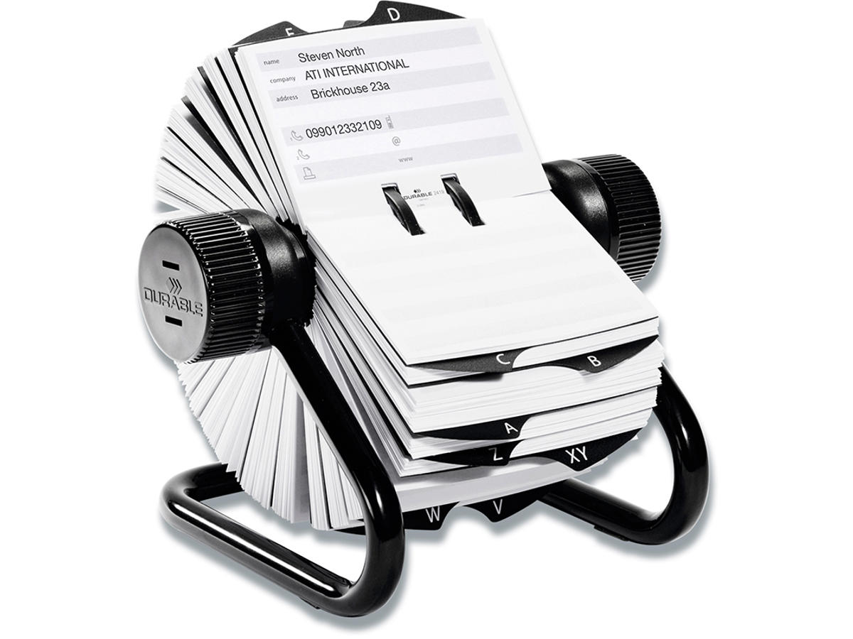 Rullekartotek til telefonnumre og adresser. Med blød rotation og låsefunktion. Leveres komplet med 500 dobbeltsidet kartotekskort (104x72 mm) og 25 delt indexfaner A-Z. Enkel fjernelse og indsættelse af kartotekskort.