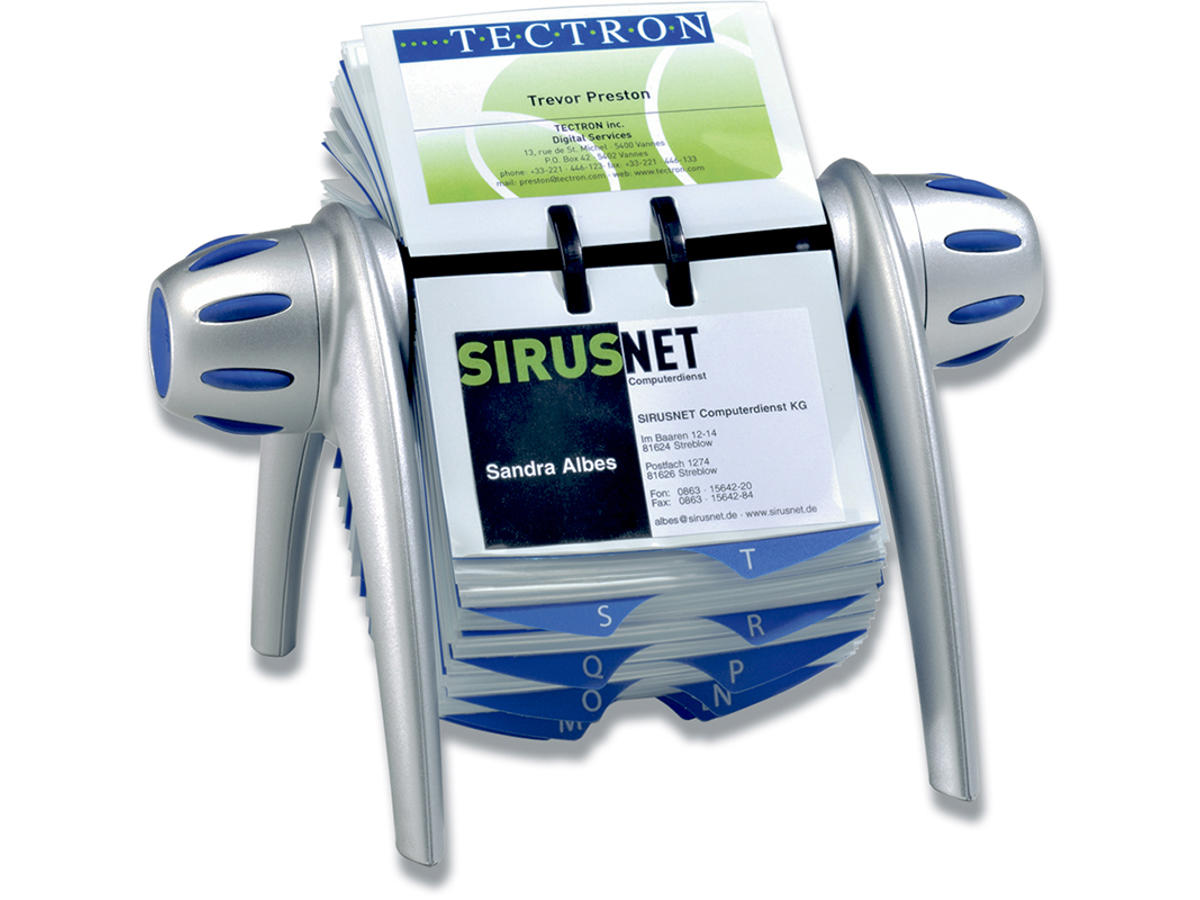Rullekartotek med blød rotation og låsefunktion. Leveres komplet med 200 lommer til 400 visitkort og 25 delt indexfaner A-Z. Lommerne er aftagelige. Mål: BxHxD 215x120x185
