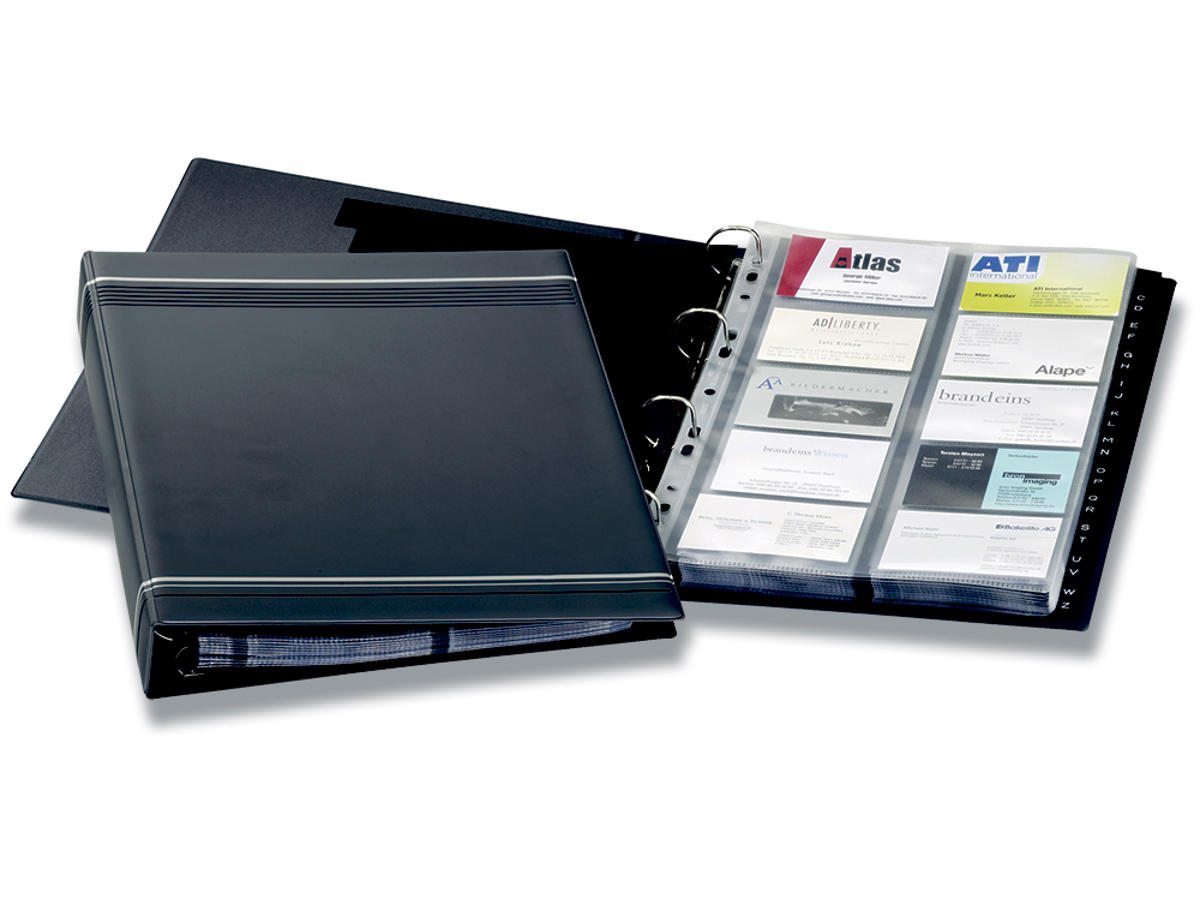Visitkortmappe med ringmekanisme. Leveres med 20 transparente visitkort lommer i pp, med international hulning med plads til 400 stk. visitkort i format 90x57mm. Kan udvides med 10 lommer med plads til 200 stk. kort (Durable art nr 238919). 12 delt indexfaner A-Z. Mål: HxB 315x255mm.