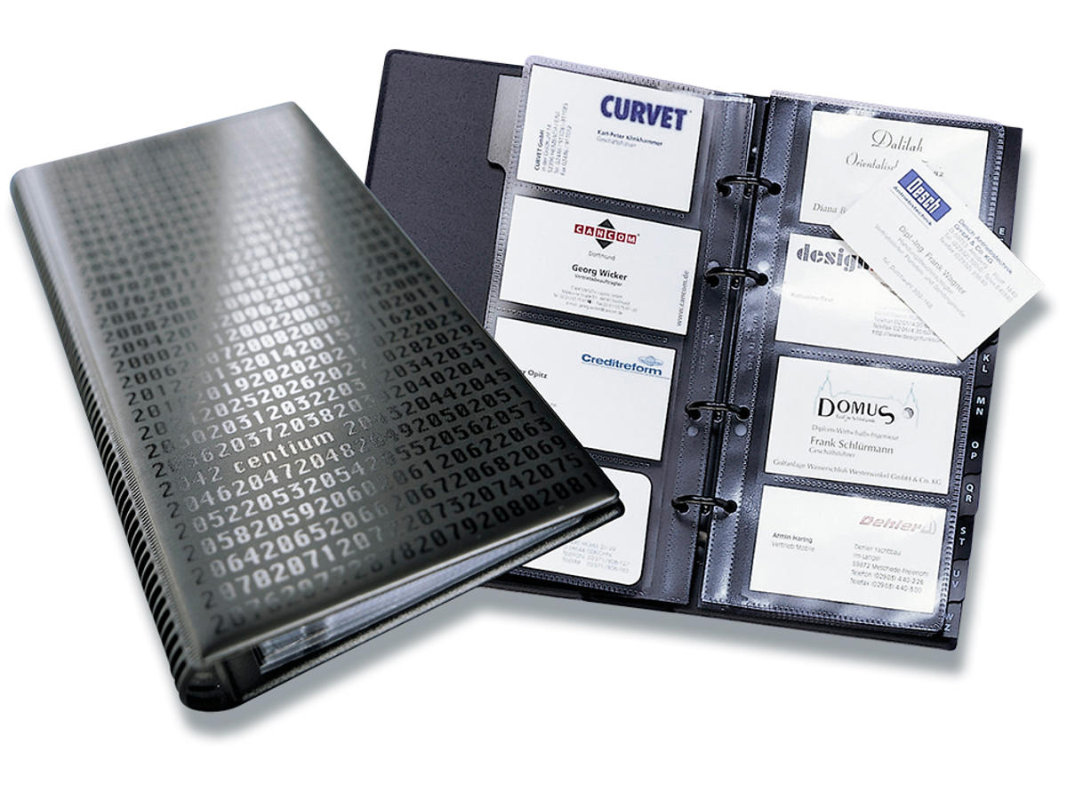 Visitkortmappe med ringmekanisme. Leveres med 25 transparente visitkort lommer i pp med plads til 200 stk. visitkort i format 90x57mm. Kan udvides med 10 lommer med plads til 80 stk. kort (Durable art nr 2387-19). 12 delt indexfaner A-Z. Mål: HxB 255x145mm.