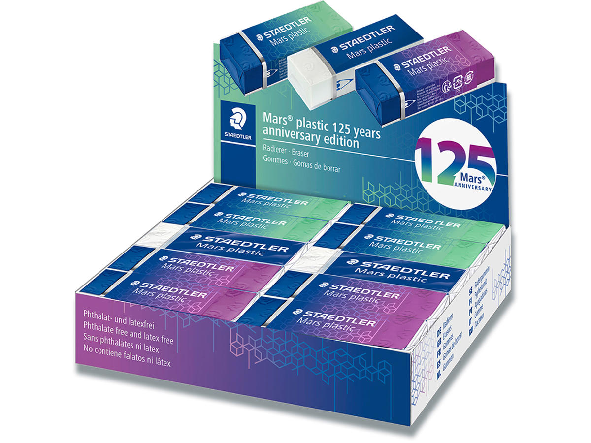 125 år med Mars®: Vi fejrer en tradition for førsteklasses kvalitet med flotte jubilæumsvarianter! Mars-mærket var allerede en af STAEDTLERs vigtigste produktserier kort efter, at det blev registreret i 1900, og det har altid stået for højeste kvalitet og præcision inden for skrivning, tegning og viskning. Mars® er gennem årtier blevet synonymt med holdbarhed og innovation. Især Mars® plastic viskelæder er kendt og værdsat for sin fremragende viskeevne i skolen, på kontoret og blandt kunstnere. Men selv tradition har brug for nyt liv! I anledning af sit 125-års jubilæum i år viser STAEDTLER, at selv hverdagsgenstande som viskelædere kan være spændende. De nye tofarvede Mars plastviskelædere bringer farve og dynamik ind i hverdagen. Med en kvalitet som du kender! Leveres i assorteret farve.