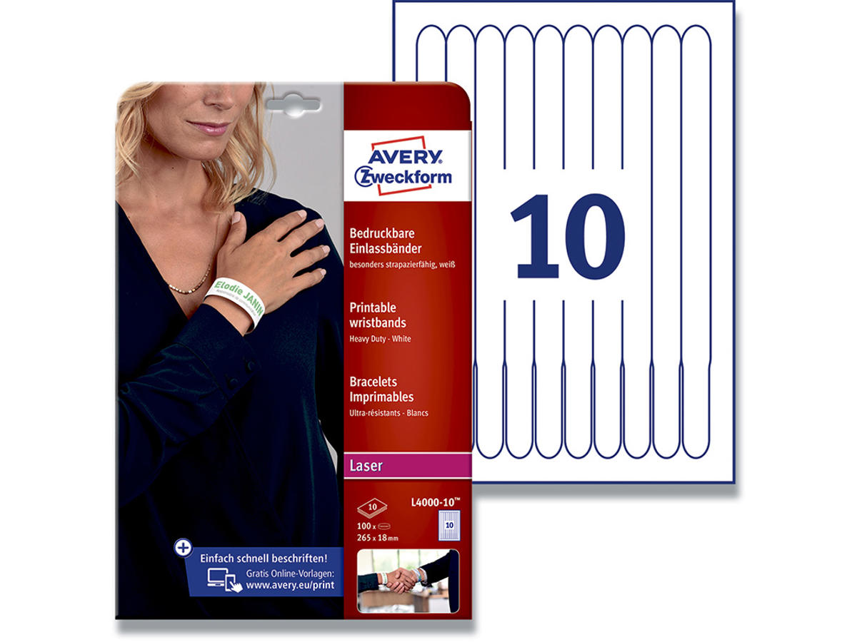 Med Averys printbare hvide armbånd kan du hurtigt og let fremstille professionelle armbånd kun ved hjælp af en computer og en printer. Armbåndene er ideelle til firmafester, møder, seminarer og arrangementer, hvor deltagerne f.eks. skal opdeles i mindre grupper, eller hvor armbåndet er adgangsgivende til udvalgte aktiviteter eller selve eventen. De printbare armbånd er også perfekte at anvende til skoleudflugter og i foreningslivet.Armbåndene tåler udendørs anvendelse, da de er resistente over for vand og snavs, og kan ikke rives over. Det bløde materiale og de glatte kanter gør dem behagelige at have på. Med mikroperforerede linjer, så de let kan fjernes, men naturligvis ikke genbruges.Avery's printbare armbånd, L4000-10, har 10 armbånd/ark og 100 armbånd/pk, hvor hver armbånd måler 265 x 18 mm, hvilket gør dem velegnet til de mest gængse kontaktoplysninger som navn, firma, logo eller event-informationer. Armbåndene er fremstillet i et PVC-frit materiale.De kan printes i alle sort/hvid og farvelaserprintere.Du kan nemt og helt gratis designe og printe dine Avery produkter med vores software Avery Design & Print, hvor du finder skabeloner, grafik og designs. Læs mere om softwaren her: - Klik her
