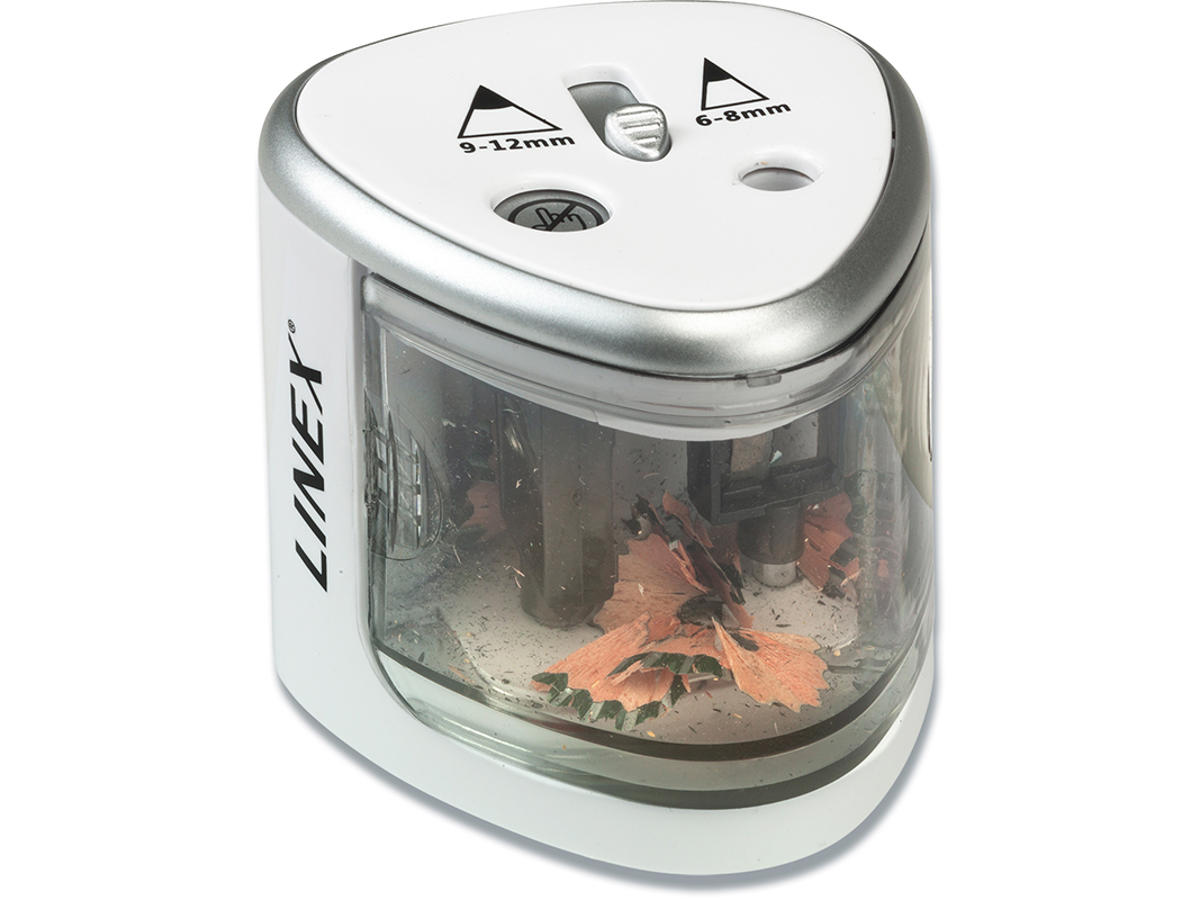 Batteridrevet blyantspidser til standard (dia. 6-8 mm) og jumbo (dia. 9-12 mm) blyanter. Gennemsigtig container, så det nemt kan ses hvornår den skal tømmes. Anvender 4 stk. AA 1,5V batterier, medfølger ikke.