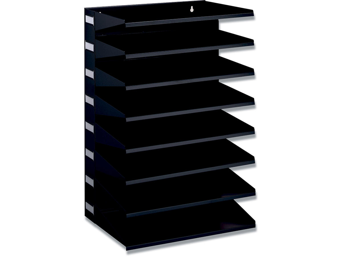 Sorteringsfag til bord eller vægmontering. Praktisk sorteringsfag med otte sektioner til A4/folioformat, af pulverlakeret stål og etiketter til opmærkning af hver hylde. Kan stå på et bord eller vægmonteres. Etiketter til mærkning medfølger. Mål: BxHxD 360x540x250mm