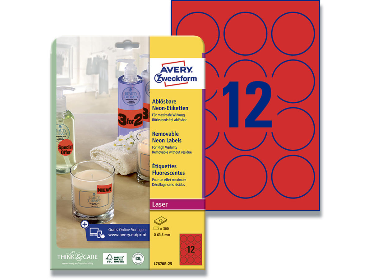 Gratis prøver, rabatter og tilbud er blot nogle af de salgsfremmende foranstaltninger, du kan bruge til at øge din omsætning. Tag kundernes opmærksomhed ved hjælp af de iøjnefaldende neon-farvet etiketter, ideel til reklame og salgsfremmende klistermærker. Brug dem over gamle prismærker til at fremhæve en ny billigere pris eller for at fremhæve at varen er ny. Uanset hvilken slags kampagne du kører, kan du med Avery's L7670R-25 aftagelige runde neon røde etiketter med 12 etiketter/ark og 300 etiketter/pakke lave etiketter med dit eget budskab på præcis når du har brug for dem. Etiketterne er aftagelige, og kan nemt fjernes uden at efterlade limrester, hvilket gør dem perfekte til midlertidig mærkning. Kan printes i alle laser- og farvelaser printere, og Avery's JamFREE™ garanti sikrer at du ikke behøver bekymre dig om etiketterne sidder fast i printeren og giver printerstop. Du kan nemt og helt gratis designe og printe dine Avery produkter med vores software Avery Design & Print, hvor du finder skabeloner, grafik og designs - Klik her