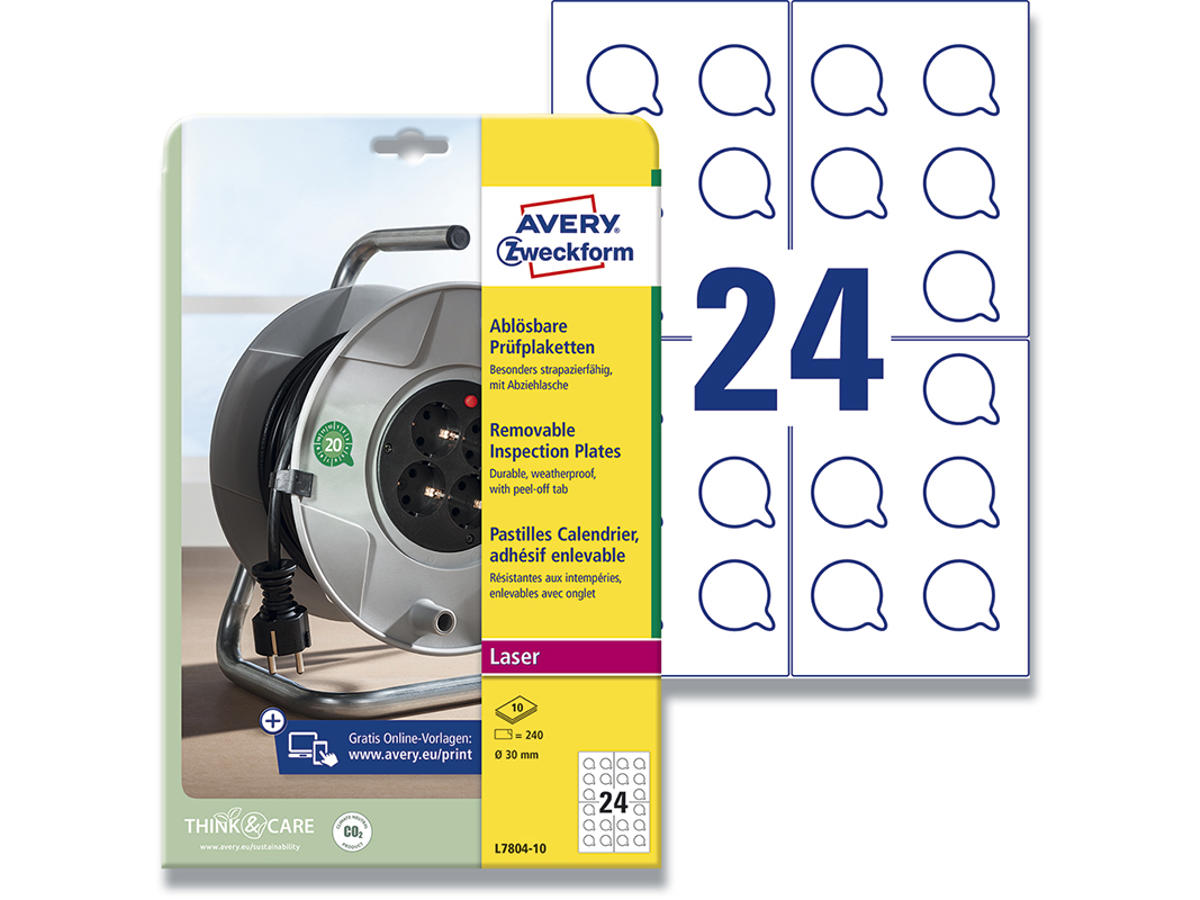 Ifølge arbejdsmiljølovgivningen stilles der krav om, at det ved passende eftersyn og vedligeholdelse skal sikres, at tekniske hjælpemidler og maskiner hele tiden under brug holdes i forsvarlig stand og er i overensstemmelse med gældende regler for deres konstruktion, udstyr og sikkerhedsanordninger. Arbejder du med eftersyn, kontrol eller vedligeholdelse af udstyr som f.eks. hejseredskaber og spil, trykbeholdere, køleanlæg og trykflasker, stiger, stilladser, pallereoler, porte, brandslukkere, gasinstallationer mv. er Avery's inspektionsdatoetiketter er den perfekte løsning til synlig mærkning af, at et lovpligtigt eftersyn, en kontrol eller inspektion har fundet sted. Etiketterne er runde og beregnet til selv at designe og printe. På den måde får du stor design fleksibilitet i forhold til inspektionsetiketter, som er fortrykt. Du kan du efter eget valg printe dato, måneder, årstal, kontrollantens navn, øvrige informationer mv. på etiketterne og påklæbe dem udstyret. Så hersker der ingen tvivl om et nødvendigt eftersyn er foretaget. Det er en nem, entydig og professionel løsning både for kontrollanten og dem, som arbejder med udstyret. Avery's L7803-10 inspektionsdatoetiketter er aftagelige, hvilket betyder, at de klæber ekstra godt, men kan fjernes igen uden at efterlade limrester. Den perfekte løsning, når er kun skal mærkes midlertidigt. Derudover er de modstandsdygtige overfor vand-, smuds-, UV- og temperaturbestandige (-20 °C - +80 °C) samt rivfaste. De har 24 etiketter/ark og 240 etiketter/pk, hvor hver etiket måler Ø 30 mm. Arkene er falset, hvilket betyder, at du nemt kan folde arket efter print og opbevare det i lommerne på arbejdstøj. Etiketterne kan printes i alle laser- og farvelaserprintere. Du kan nemt og helt gratis designe og printe dine Avery produkter med vores software Avery Design & Print, hvor du finder skabeloner, grafik og designs - Klik her