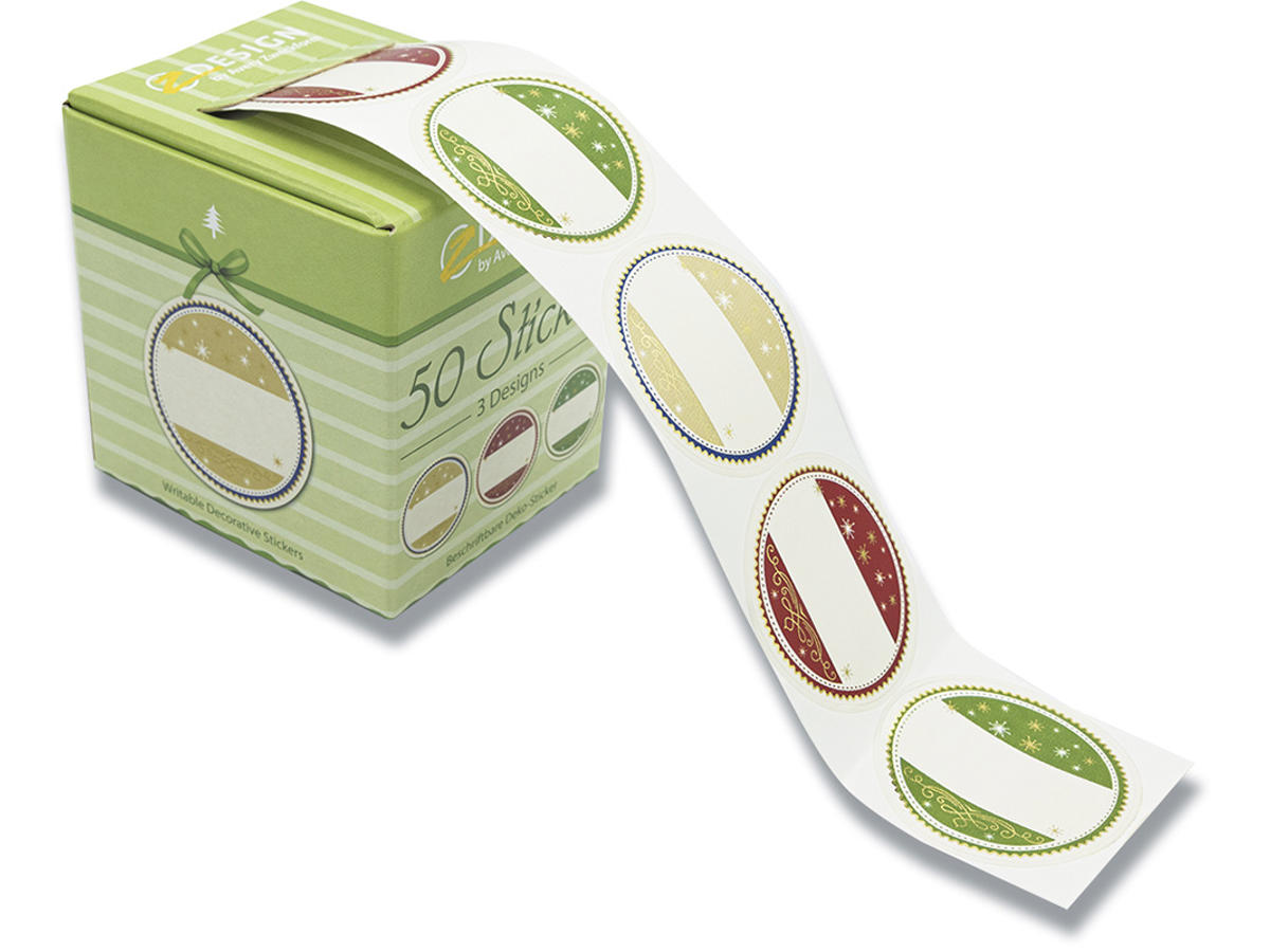 De klæber permanent og pålideligt papir, karton, fortrykte kort, gavepapir, cellofan og lignende materialer. Til og fra mærkaterne er naturligvis gennemtestet og i højproduktkvalitet. Avery's 56829 indeholder 50 stickers mixet med minimum 3 motiv-variationer. De sælges på rulle i en smart dispenser, som gør brug og opbevaring nem. Brug en permanent marker eller tusch til at skrive mærkaterne