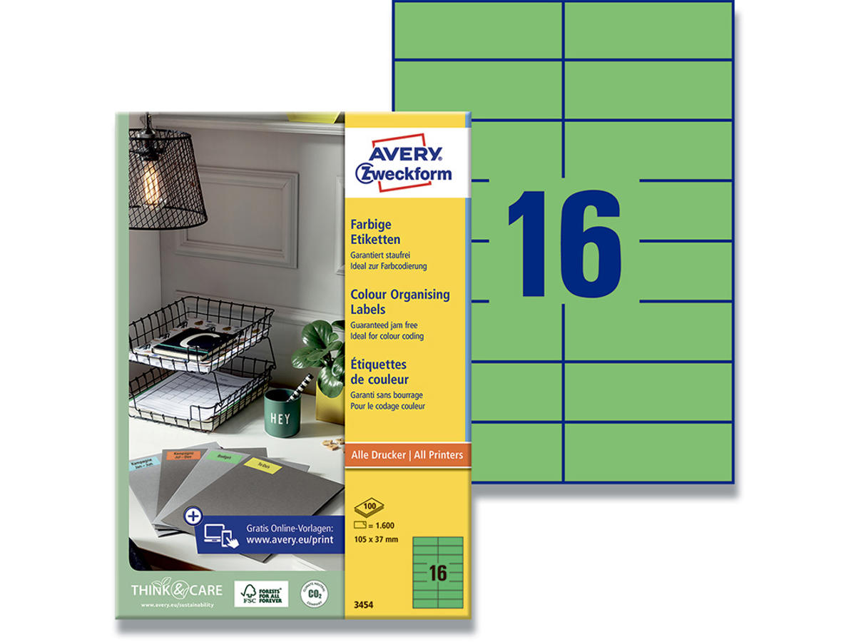 Farvede etiketter får mere opmærksomhed. Alle virksomheder sætter pris på orden. En måde at skabe orden på, er at sortere dine dokumenter efter farve, brug f.eks. Avery's 3454 permanentklæbende grønne etiketter med 16 etiketter/ark og 1.600 etiketter/pakke til dine kunders dokumenter, gul for dine leverandører, rød til interne dokumenter osv.