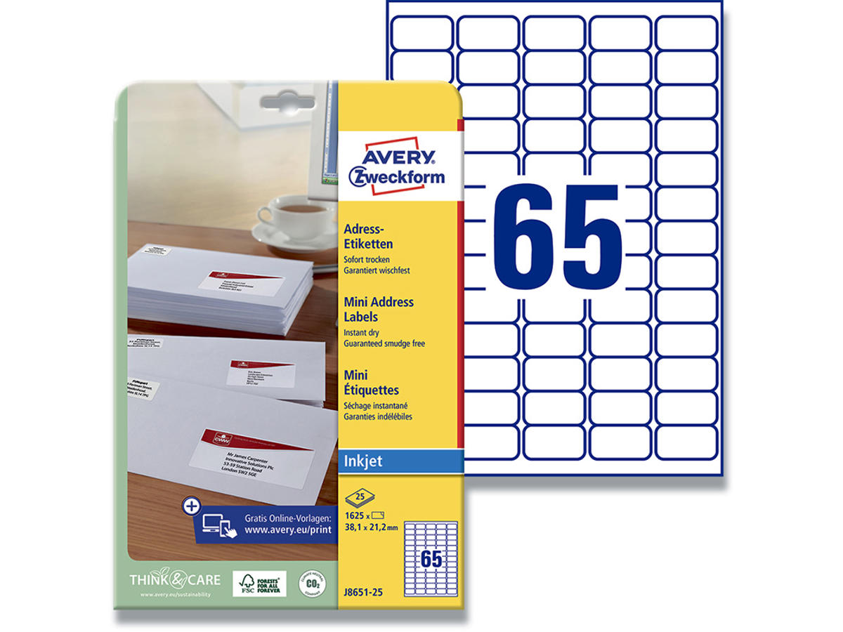 Arbejder du hovedsagligt med en inkjetprinter og har du ikke tid til at vente på at blækket tørrer, så skal du vælge Avery J8651-25 hurtigtørrende etiketter til inkjet printere med 65 etiketter/ark og 1.625 etiketter/pk. De er velegnede som returadresseetiket til breve, pakker og rør i alle størrelser, så din post kommer retur ved forkert modtageradresse, samt til EAN-koder og mærkning af små emner, dokumenter, mapper og ringbind. Deres special coatede QuickDRY™ overflade sørger for at blækket øjeblikkeligt absorberes i papiret, så du kan tage arket direkte fra printeren og arbejde med det uden afsmitning af blæk. Avery's JamFREE™ garanti sikrer at du ikke behøver bekymre dig om etiketterne sidder fast i printeren og giver printerstop. Avery's aftagelige universaletiketter hjælper dig også med at passe på miljøet, da de kan genanvendes sammen med almindeligt papiraffald. Du kan nemt og helt gratis designe og printe dine Avery produkter med vores software Avery Design & Print, hvor du finder skabeloner, grafik og designs - Klik her