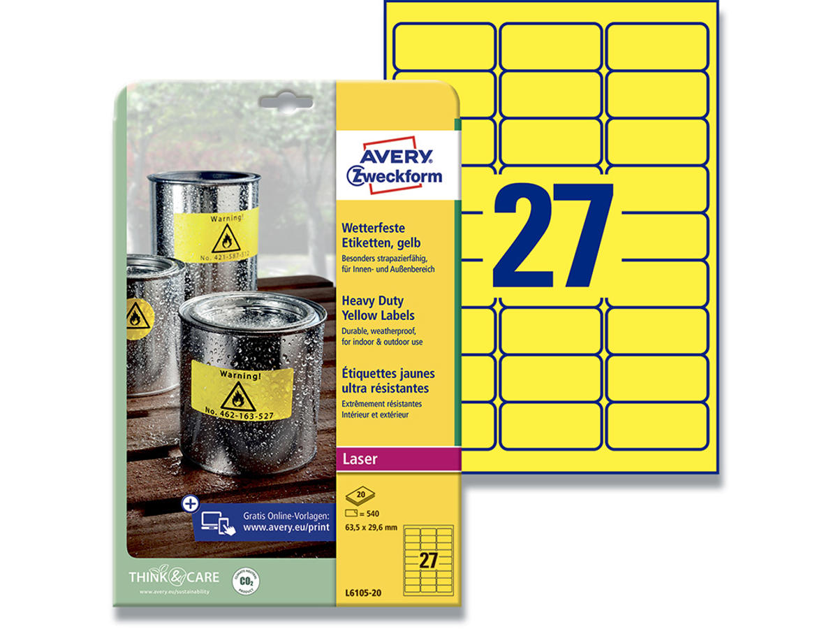 Instruktioner, vigtige meddelelser og advarsler skal være iøjnefaldende og fremstå klare og tydelige for læserne! Men hvordan kan du sikre dig, at dine instruktioner, vigtige beskeder og advarsler fanger alles opmærksomhed, er letlæselige og bliver siddende, hvor du hænger dem op? Avery’s stærke gule etiketter er særdeles velegnede til vedvarende permanent, synlig og iøjnefaldende advarselsskiltning og mærkning både inden- og udendørs, og et absolut godt valg. De er fremstillet i et stærkt holdbart polyestermateriale, som ikke kan rives i stykker, og de klæber permanent og pålideligt. Etiketpapiret er skarp gult, og papirkvaliteten giver dig flotte og knivskarpe prints. Etiketterne er modstandsdygtige overfor olie, snavs, vand, fugt, UV-stråler og temperaturer mellem -20°C og +80°C. Det gør dem ideelle udendørs i alt slags vejr og indendørs, i miljøer med høje krav til holdbarhed. Anvendelsesmulighederne indenfor advarselsskiltning og mærkning er utallige. De henvender sig f.eks. til elektrikere, installatører håndværkere, produktionsvirksomheder, malervirksomheder, laboratorier, hospitaler, lagerfaciliteter m.v. hvor arbejdssikkerheden skal være i top, og hvor der mange advarsler forbundet med brug af produktionsudstyr, el-tavler, målerskabe mv. Avery's L6105-20 gule stærke etiketter har 27 etiketter/ark og 540 etiketter/pk, hvor hver etiket måler 63,5 x 29,6 mm. Etiketternes størrelse er velegnet til mellemstore genstande. Etiketterne kan printes i alle s/h laserprintere. Og Avery's JamFREE™ garanti sikrer at du ikke behøver bekymre dig om etiketterne sidder fast i printeren og giver printerstop. Du kan nemt og helt gratis designe og printe dine Avery produkter med vores software Avery Design & Print, hvor du finder skabeloner, grafik og designs - Klik her