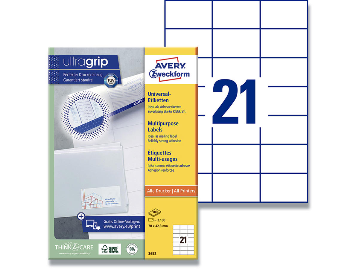 Har du flere forskellige typer printere på kontoret? Intet problem, du behøver kun købe én slags etiketter, for med Avery&rsquos hvide 3652 Universaletiketter med Ultragrip til indendørsbrug med 21 etiketter/ark og 2100 etiketter/pk, får du etiketter der kan bruges til både s/h- og farvelaserprintere, inkjetprintere samt kopimaskiner. Så behøver du ikke længere bekymre dig om du har lagt etiketterne til Inkjetprinteren i Laserprinteren.