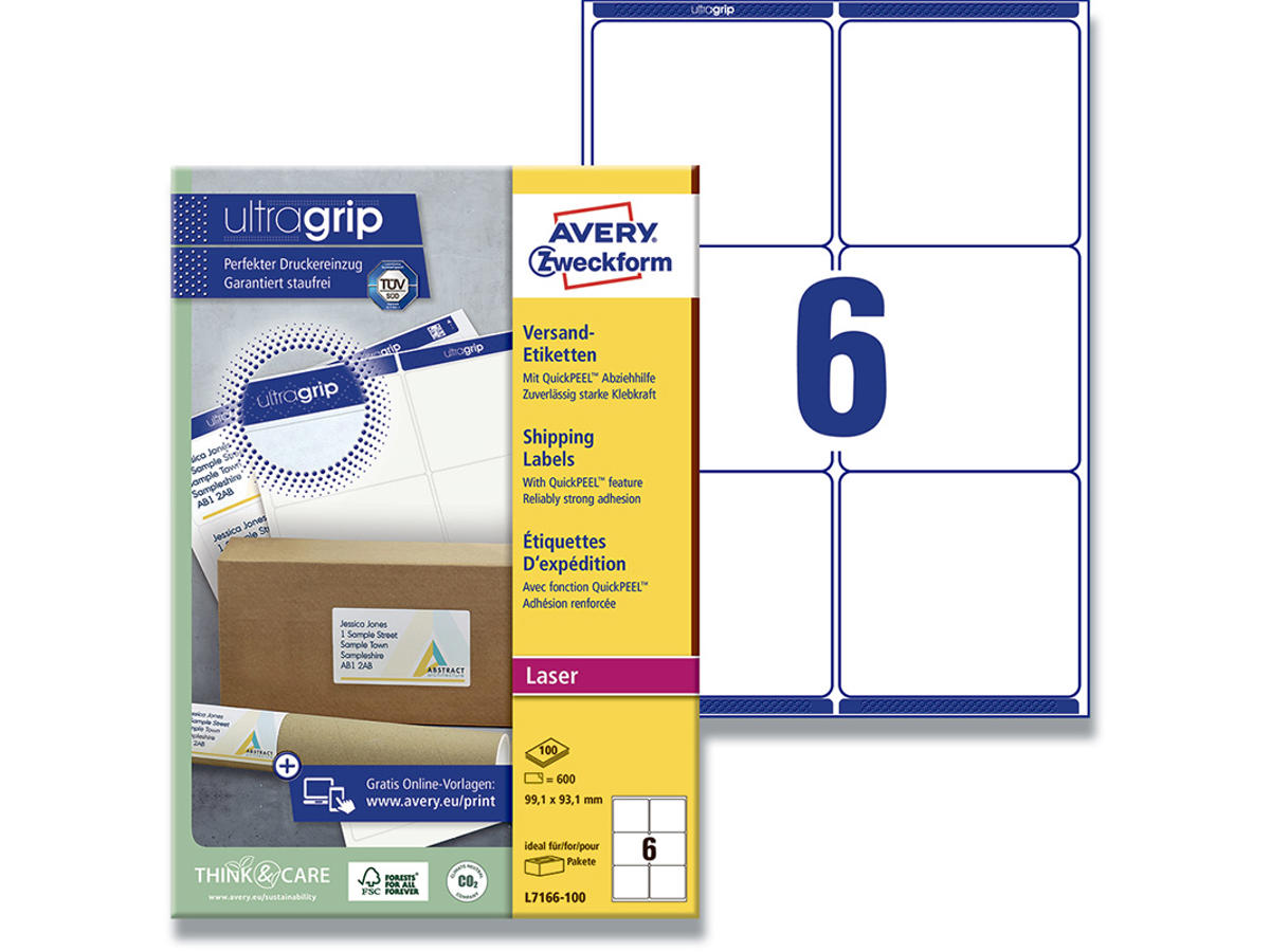 Giv dine pakker og breve et professionelt udtryk ved at bruge Avery pakke-etiketter. Avery's L7166-100 pakke-etiketter med QuickPEEL™ & Ultragrip har 6 etiketter/ark og 600 etiketter/pk, og er fremstillet i et højkvalitetsmateriale, der holder til hele turen.