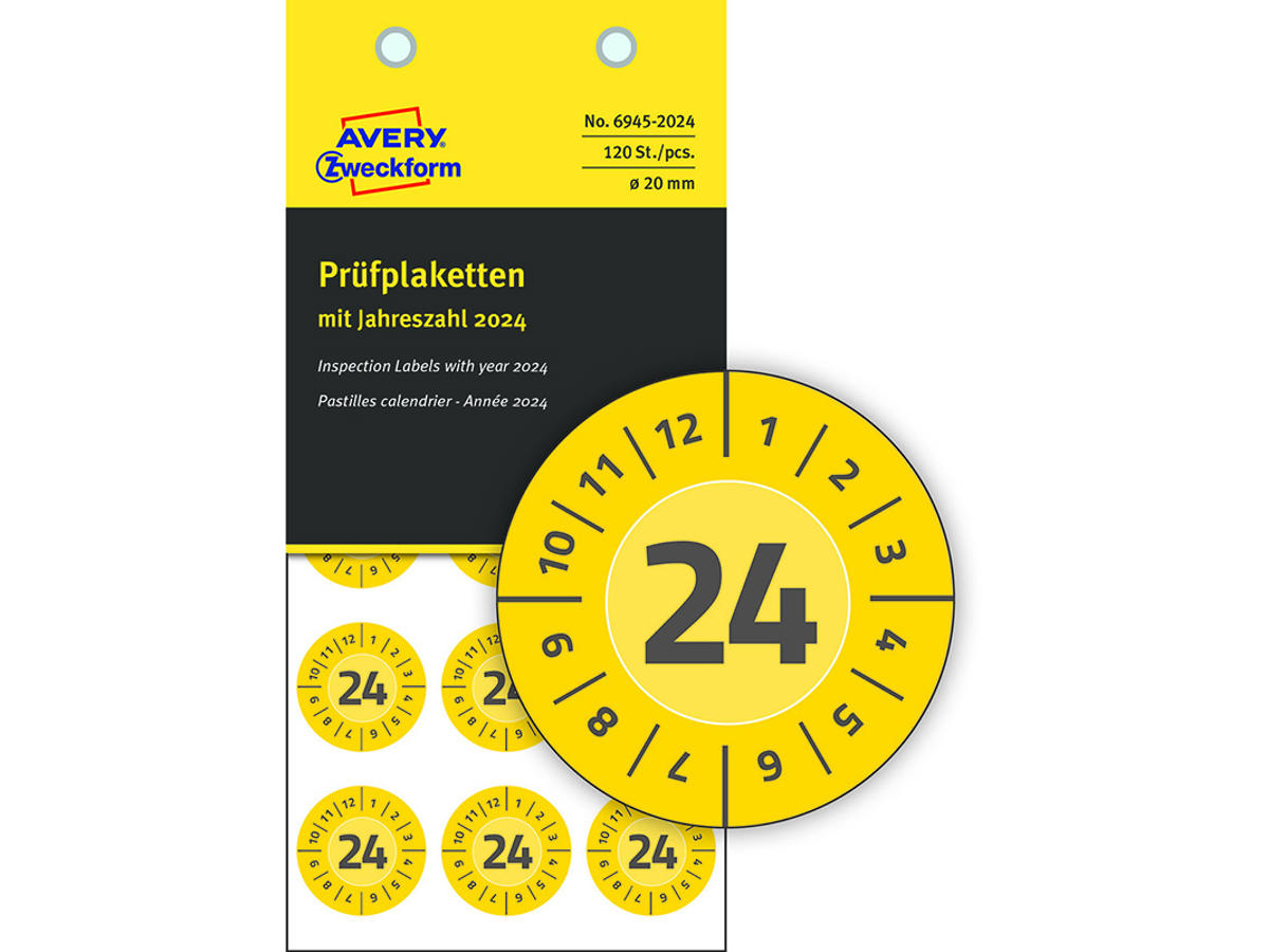 Etiketter, Ø20 mm, 2024 Gul, 120 etiketter i alt, Avery NoPEEL Inspektion