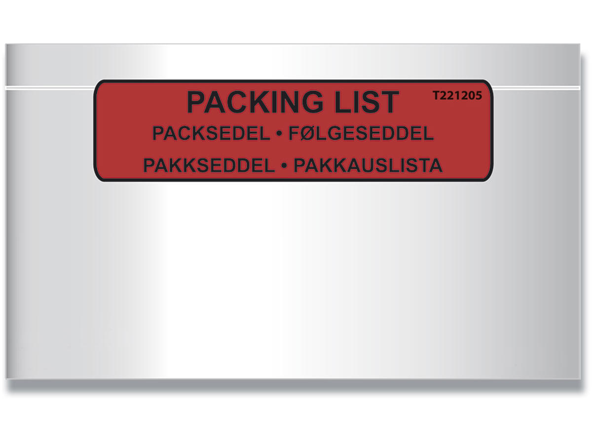 Selvklæbende plastlommer der klæbes på pakker og paller inden forsendelse effektiviserer forsendelsen. Når indholdet er emballeret, kan dokumentation og adresseoplysninger vedlægges samlet i plastlommen. • Til rutineudsendelser • Sikker og vandafvisende • En lomme til fakturaer, følgesedler og/eller adresseoplysninger • Vis indholdet eller vedlæg dokumentation og instruktioner
