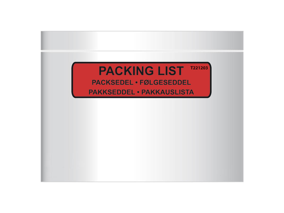 Selvklæbende plastlommer der klæbes på pakker og paller inden forsendelse effektiviserer forsendelsen. Når indholdet er emballeret, kan dokumentation og adresseoplysninger vedlægges samlet i plastlommen. • Til rutineudsendelser • Sikker og vandafvisende • En lomme til fakturaer, følgesedler og/eller adresseoplysninger • Vis indholdet eller vedlæg dokumentation og instruktioner