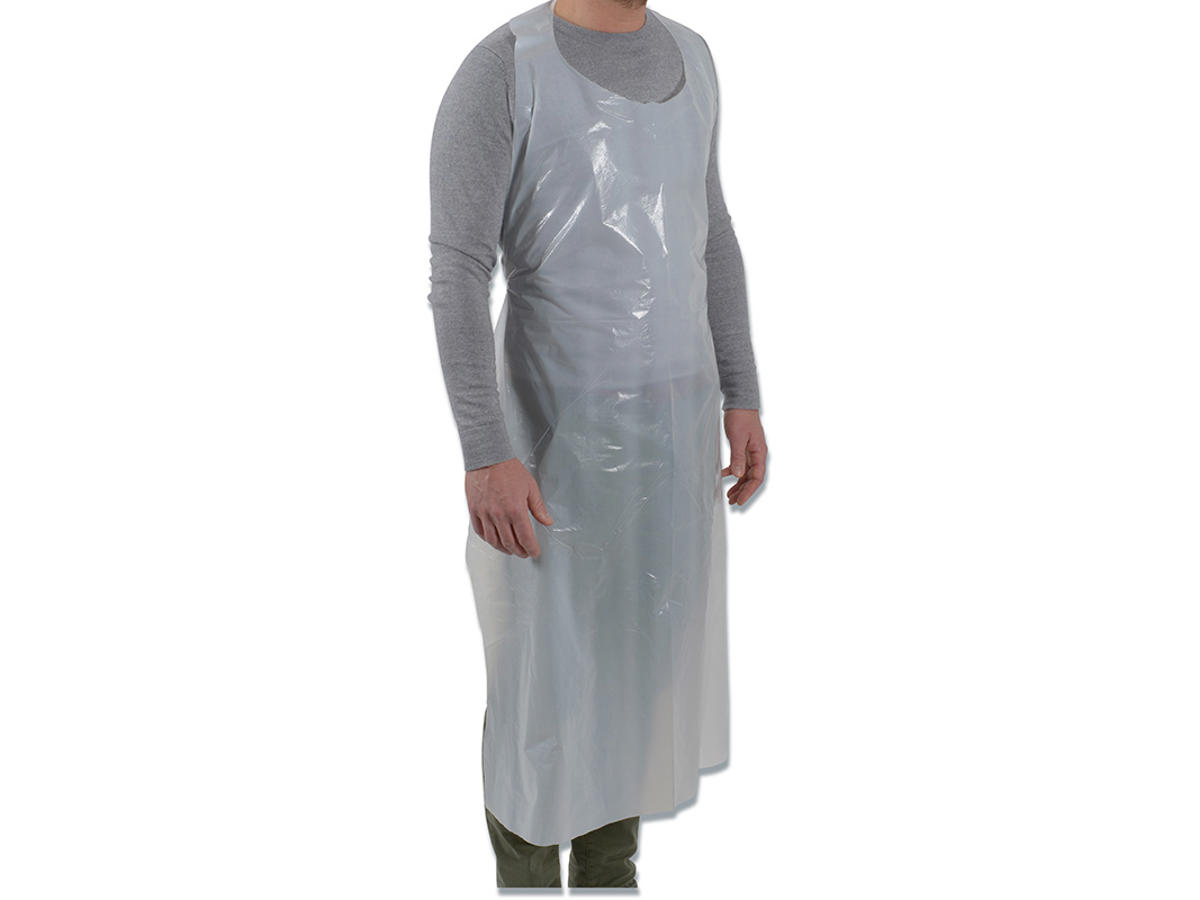 Engangs plastforklæde med lukket bånd om nakken og bindebånd på ryggen, pakket i stor dispenser. Anvendes som beskyttelse af brugeren hvor der er behov for høj hygiejnisk standard f.eks. Indenfor sundhedssektoren, ved fremstilling af fødevarer, under en produktion eller ved forpakning af varer. Fødevaregodkendt iht. 1935/2004/EU, 10/2011/EU, 89/686/EEC. Føres over hovedet og bindes i livet.