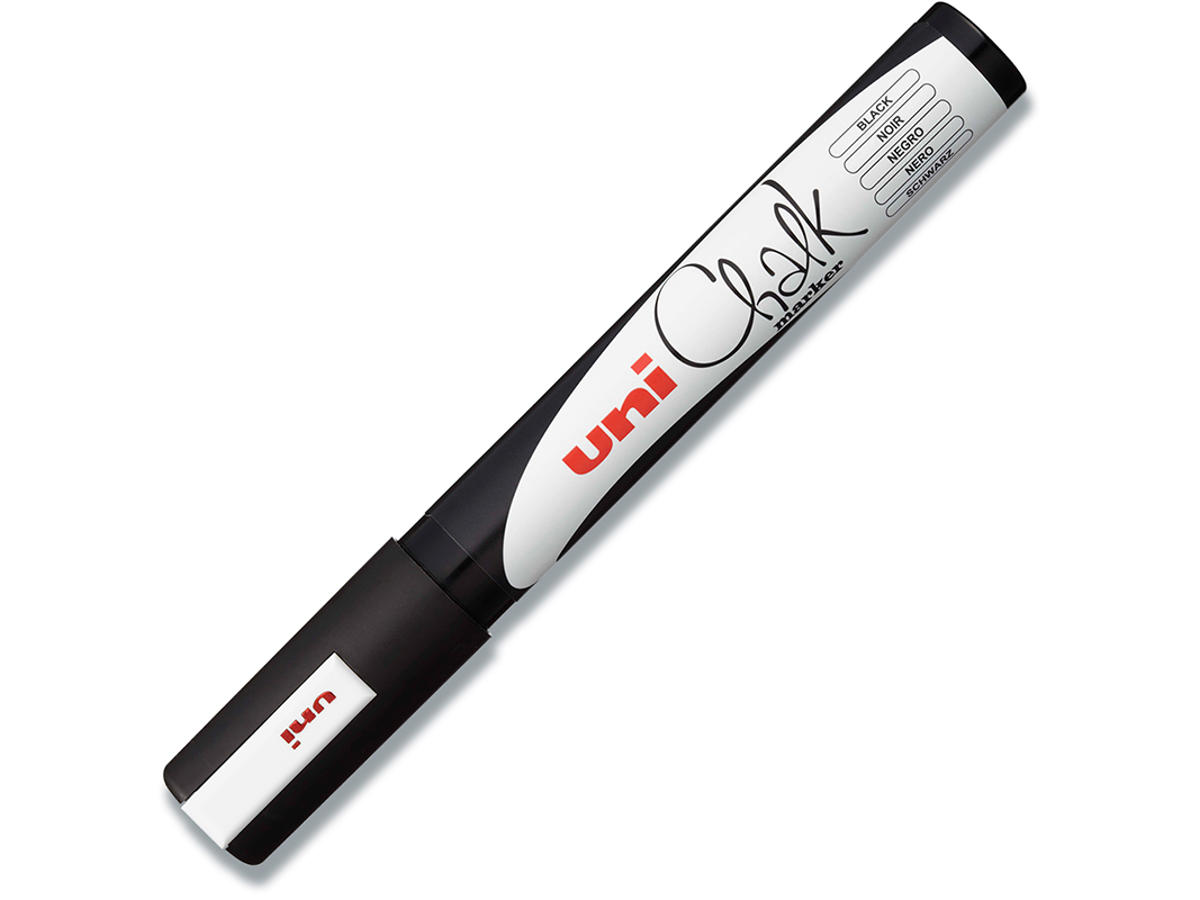 Uni Chalkmarkere. Perfekt til mærkning udendørs! Anvendes på glatte og jævne overflader som ikke er porøse, så som tavler, glas-tavler, vinduer, metal og plastik. Uni Chalkmarker er vandfast og holdbar udendørs. Skriv eller tegn, lad det tørre og det kan regne uden at ordene eller tegningerne forsvinder. Blækket kan altid fjernes med en våd klud. Uni Chalkmarker er perfekt til at skrive og tegne -også der, hvor der er behov for at ændre budskabet løbende f.eks. på restauranter eller i detailbutikker. Blækket er opaque, og med mange forskellige farver får du flotte resultater på glastavler og ikke-porøse overflader.
