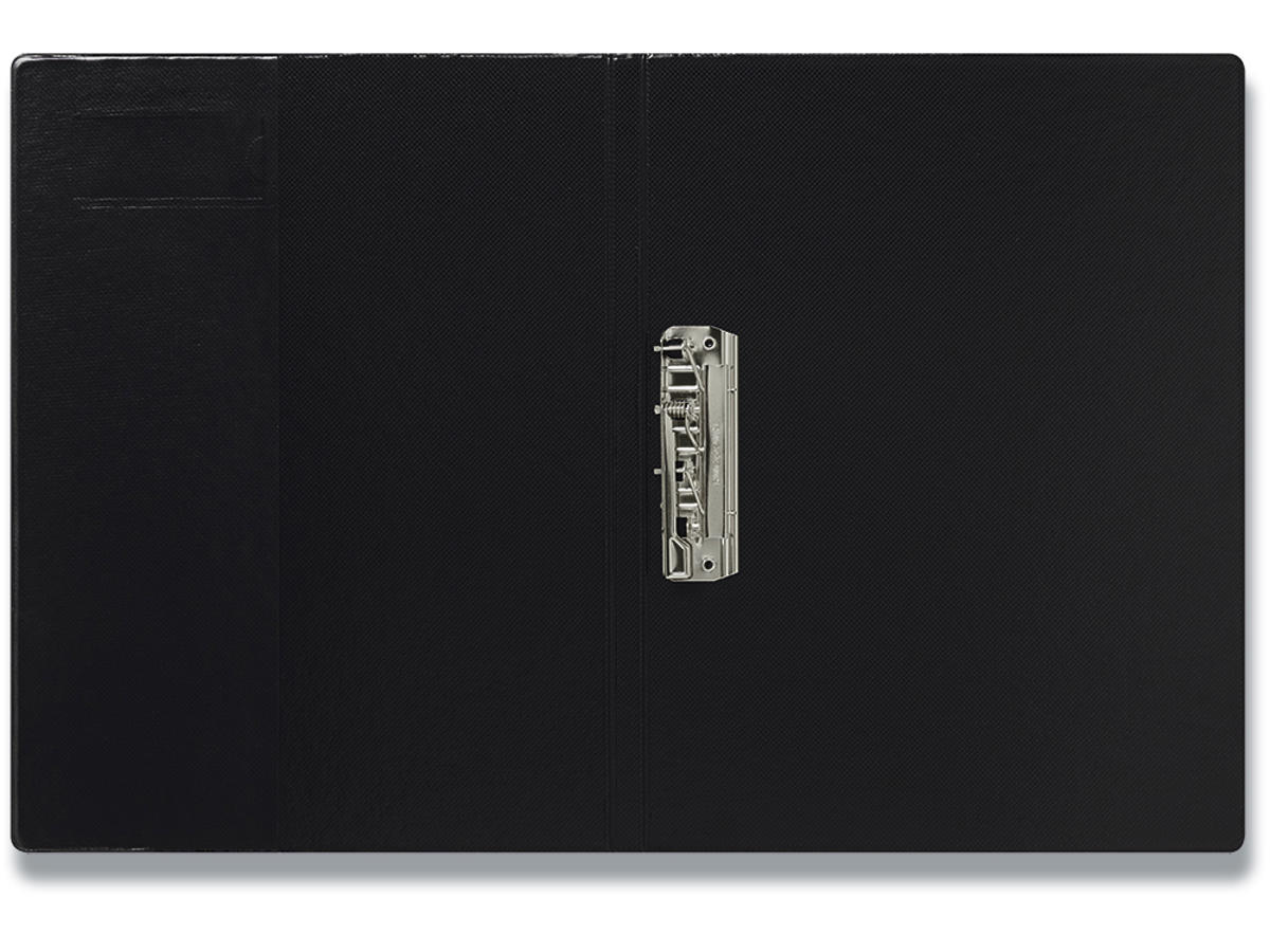 Spring-clip holder dokumenterne - ikke nødvendigt at hulle papirerne. Med forside for at beskytte dokumenter. Kan også bruges som konferencemappe eller clipboard. Rygbredde 15 mm. Klar lomme på side 2. Etiketrude på forsiden.