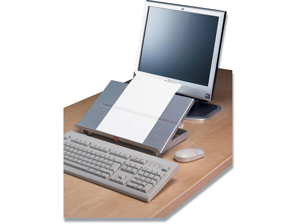 Med magnetlineal. Til rigtig synsafstand og synsvinkel. Stærk og stabil, kan bære et ringbind. Læsepladen har målene: 240x375mm.