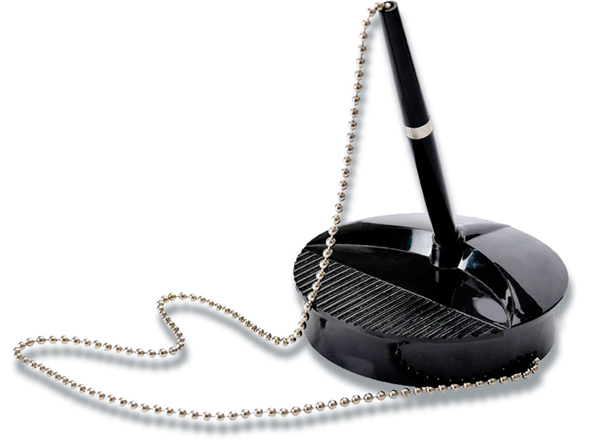 Skrivebordspen eller Counter desk pen. Velegnet til brug på diske og skriveborde. 520 mm krom kæde. Stabil 300g base. Indeholder dobbeltsidede monteringspuder til disken.