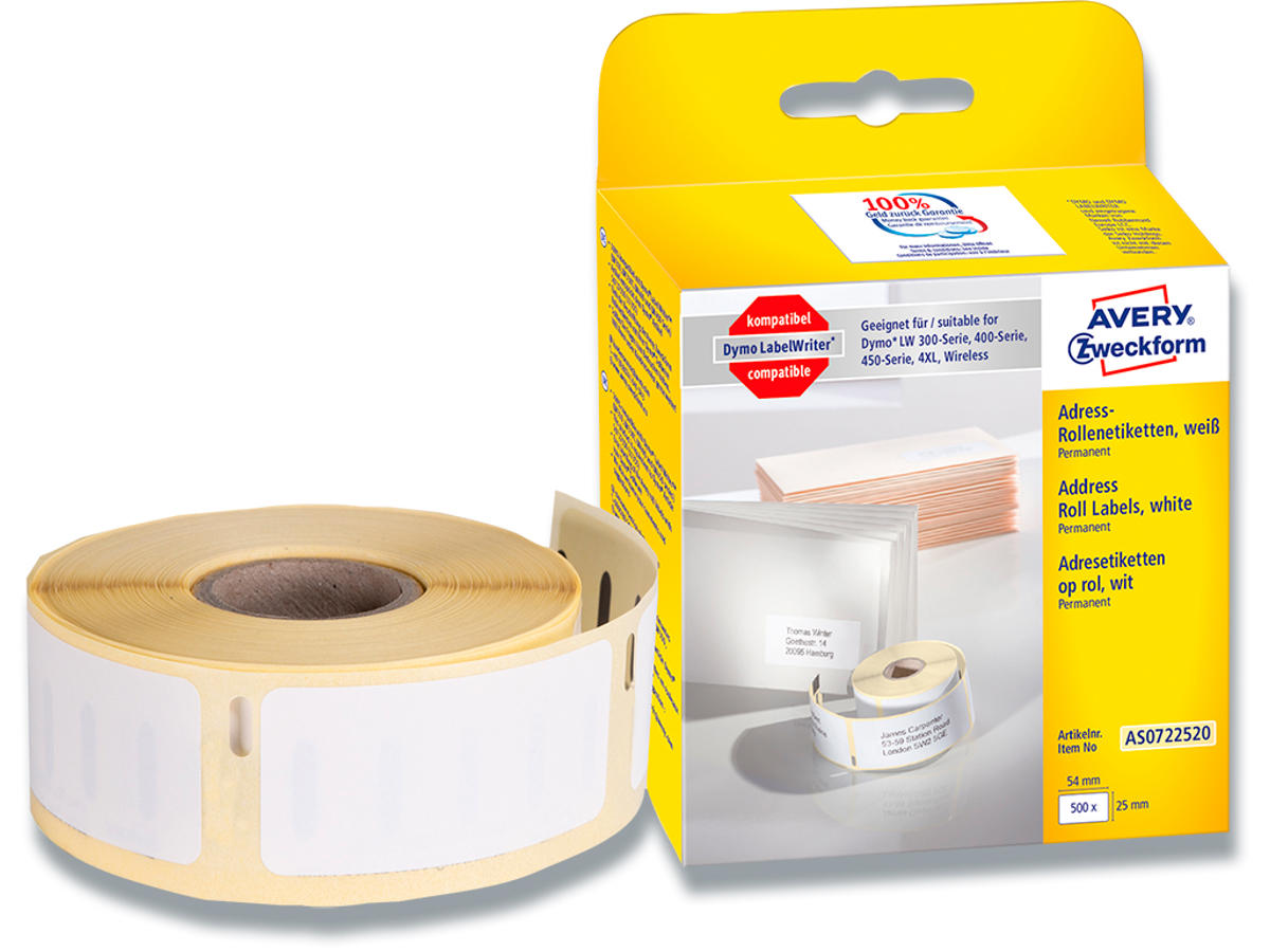 Med denne pakke får du Avery's velkendte kvalitetsetiketter til en meget attraktiv pris. I pakken får du 1 rulle med 500 etiketter 54 x 25 mm på. De er velegnede til breve, post og andre forsendelser. Thermoetiketterne er kendetegnet ved en usædvanlig god klæbeevne og er fri for Bisphenol A (BPA). Etiketterne kan genanvendes sammen med almindeligt papiraffald. Du kan nemt og efter behov printe en eller flere etiketter ad gangen.