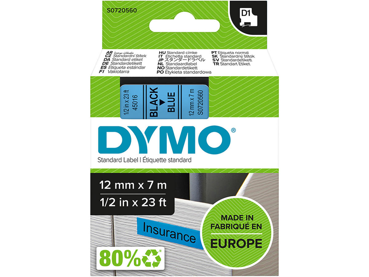 Dymo D1 fås i mange farver, både tape- og trykfarve, flere bredder og med aftagelig eller permanent lim.