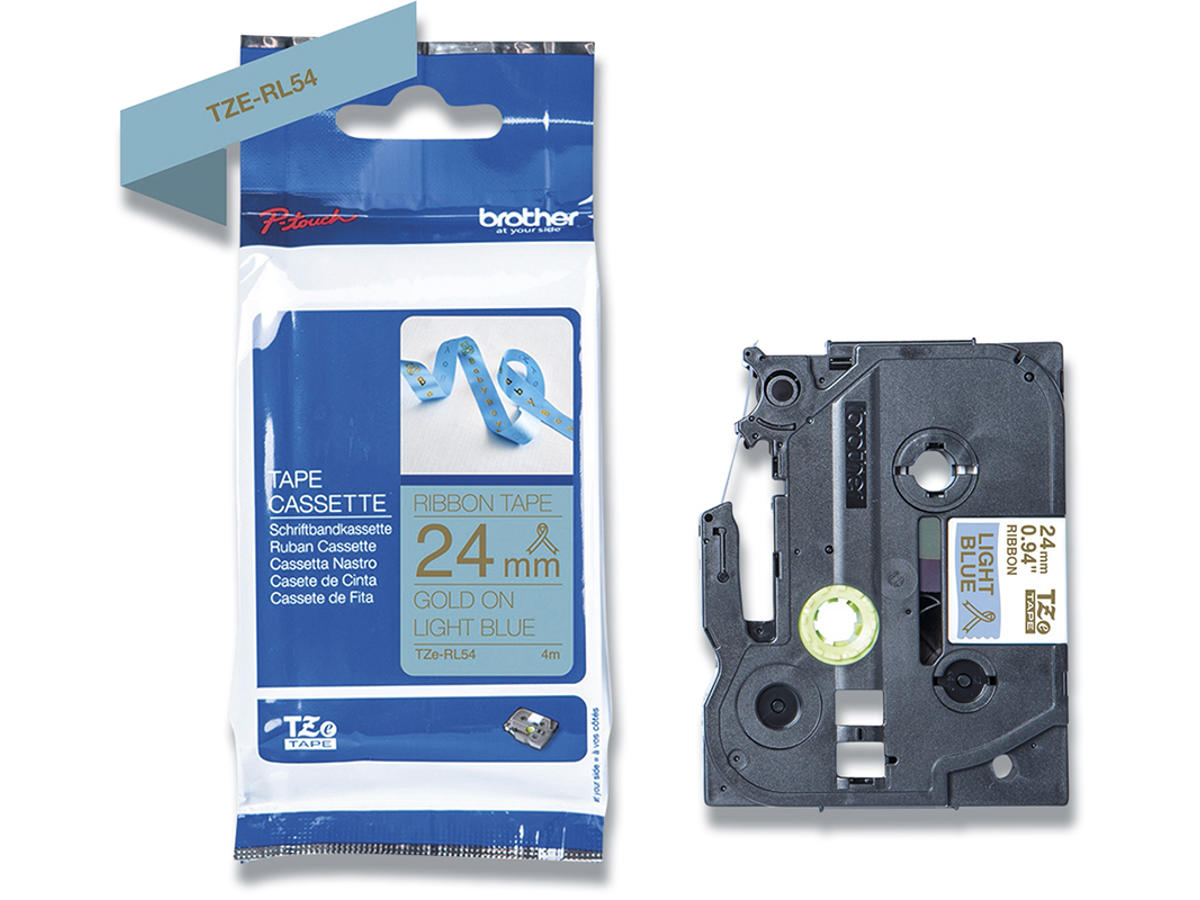 Labeltape, 24mm x 4m, Guld på Lyseblå satin stofbånd, 1 rulle, Brother P-Touch TZe-RL54