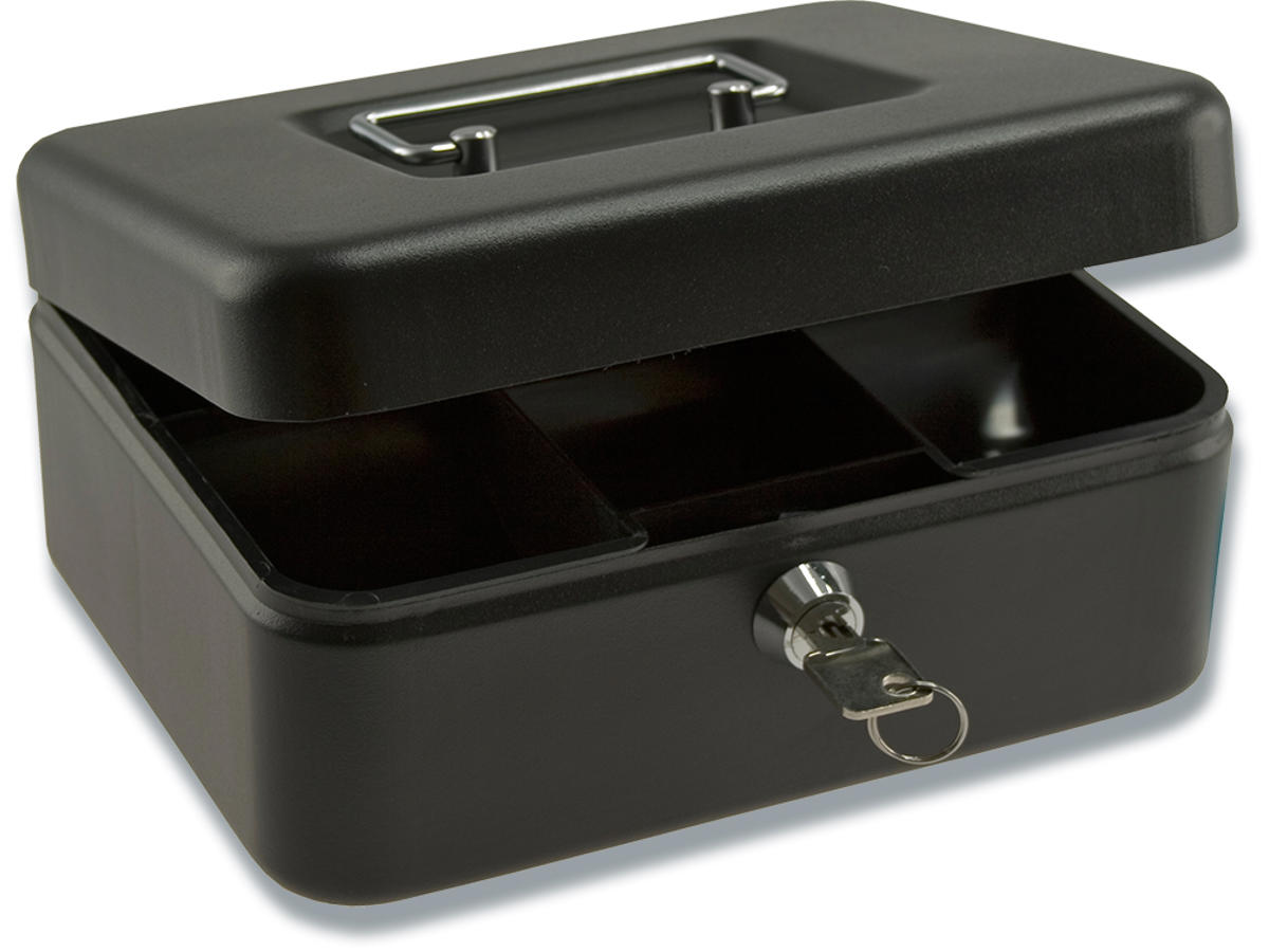 Støbt plade med bærehåndtag, indvendig kasse i plast med 6 møntrum. Cylinderlås, to nøgler inkluderet. 300x240x90mm.