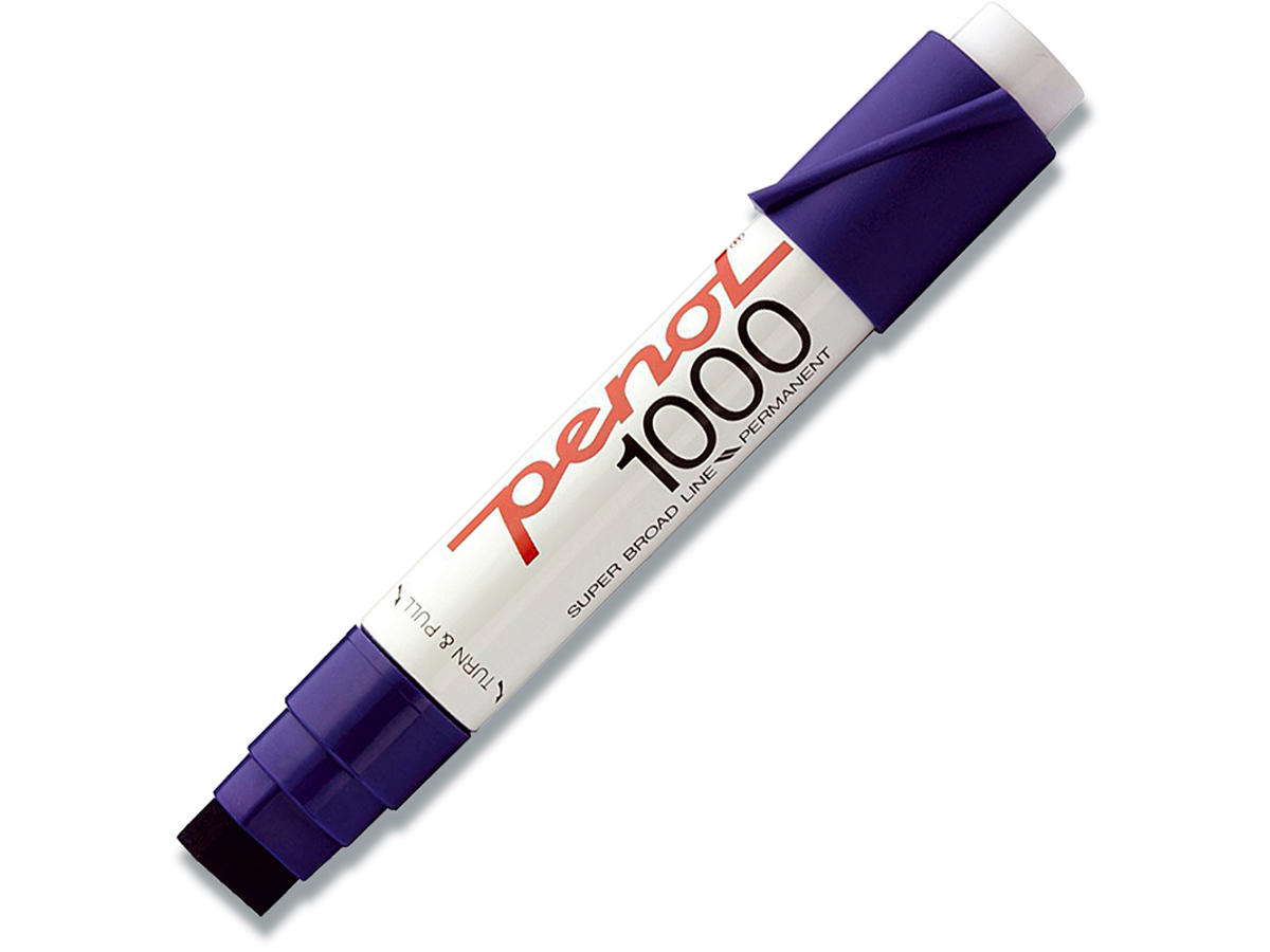 Denne fast marker har ekstra bred shisel spids, hvilket gør denne vandfaste Penol pen, særlig velegnet til skrivning af skilte. Med den skrå spids har markeren en skrivebredde på 3-16 mm. Penol 1000 blå permanent marker er desuden velegnet til, at tegne/skrive på alle glatte materialer, som f.eks. glas, plastik og metal uden at prelle af. Den permanente blæk er vind og vejr bestandig, og kan derfor også anvendes udendørs. Permanent markeren er i aluminium og plasthætten indikerer markerens farve. Der er mulighed for genopfyldning af denne Penol pen. Den permanente marker fås ligeledes i farverne grøn, rød og sort.