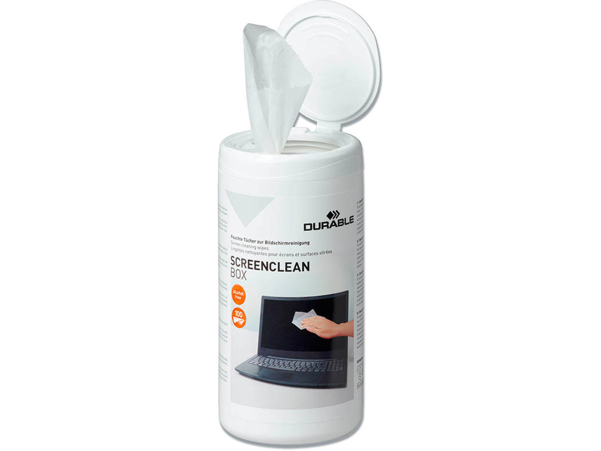 Beholderen indeholder 100 fugtige renseservietter SCREENCLEAN. Til rengøring af skærme, bærbare computere og glasflader på kopimaskiner og scannere. Har antistatisk virkning, er uden alkohol og er bionedbrydelig.
