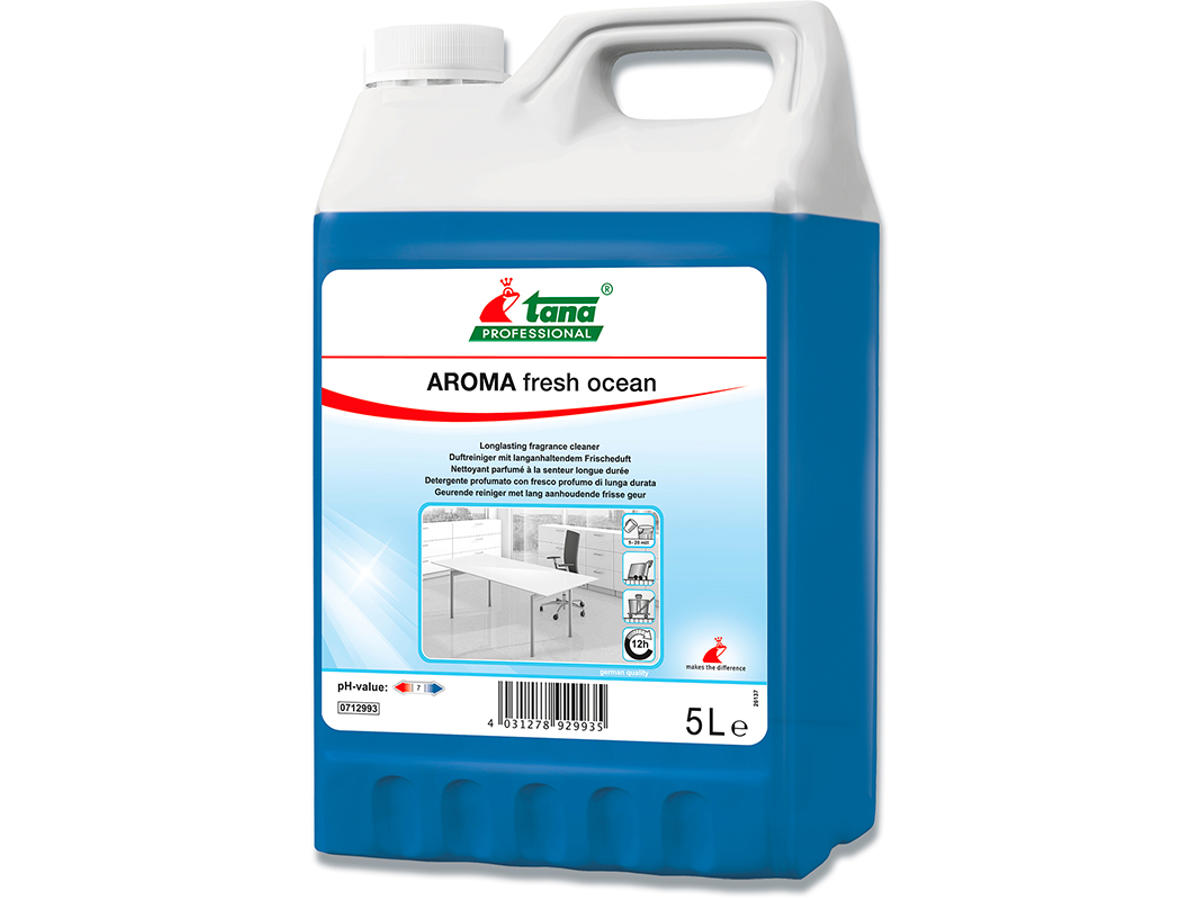 AROMA fresh ocean efterlader en udsøgt og langtidsvirkende, behagelig duft af fyr med et anstrøg af citrus efter rengøring. AROMA fresh ocean gør effektivt rent og fjerner lugte. Med AROMA fresh oceans specielle formulering er både manuel og mekanisk anvendelse mulig. AROMA fresh ocean efterlader en udsøgt duft på stedet i op til 12 timer. AROMA fresh ocean muliggør blid rengøring af alle vandfaste overflader. Påføres let på behandlede og ubehandlede gulvflader samt på alle vandfaste overflader såsom fliser, marmor, belagte og ubelagte gulve på sanitære områder, omklædningsrum, kontorer osv. Ikke til brug på ikke-forseglede trægulve og gulvtæpper.