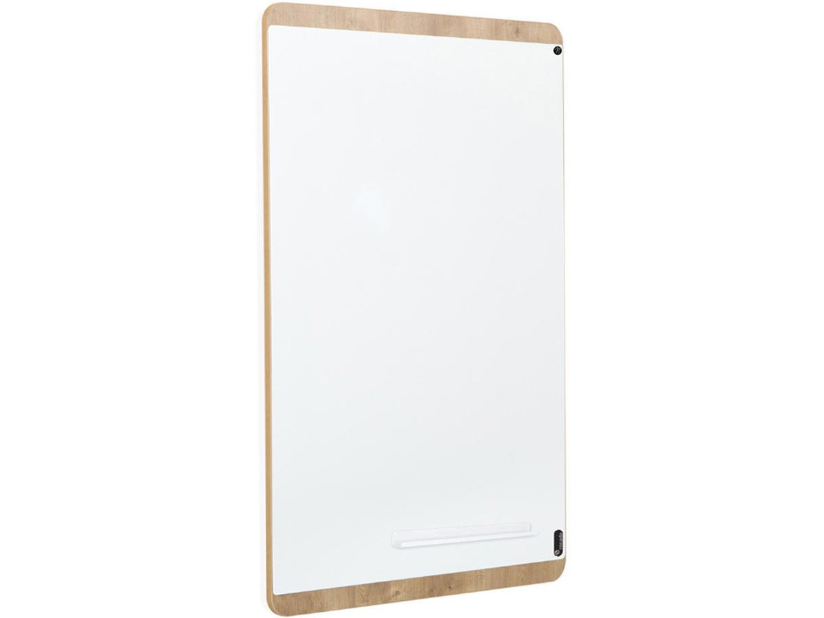 Rocada rammeløse, magnetiske whiteboard tavle i lakeret stål, med detaljer i melamin med flot træstruktur.