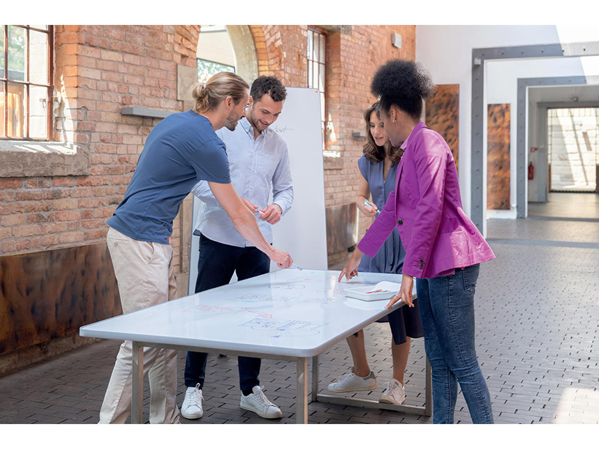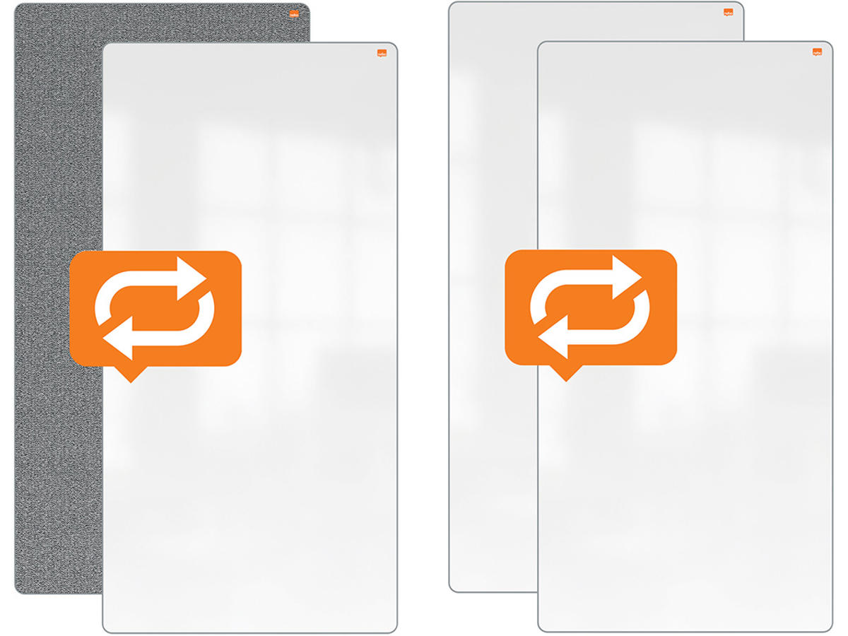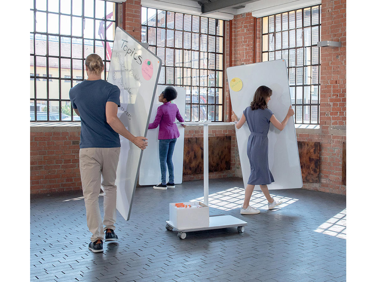 - Tilbyder fleksibilitet og samarbejde og kan indeholde op til 4 flytbare dobbeltsidede whiteboards eller opslagstavler i en kombination.