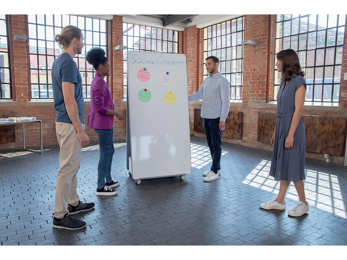 Move & Meet mobilt system til samarbejde tilbyder ultimativ fleksibilitet i ethvert arbejdsmiljø og kan nemt konfigureres til at opfylde dine behov perfekt. Leveres med en mobil base og 2 x aftagelige dobbeltsidede magnetiske whiteboards og 2 x dobbeltsidede whiteboards/opslagstavler, der sidder sikkert på plads. I alt otte overflader, der skaber et samarbejdsområde, hvor man kan planlægge projekter og idéer. Med et moderne og innovativt buet hjørnedesign med skridsikker kant vil tavlerne passe til ethvert miljø. Komplet med et omfattende sæt til samarbejde med over 1900 artikler. Hver tavle har en størrelse på 1800x900 mm.